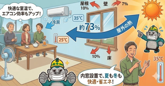夏の暑さの原因は、窓から差し込む直射日光と、熱せられた外気です。
