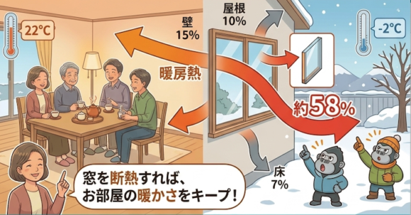 • 冬の暖房時 室内の熱の約58%が窓から逃げていきます。